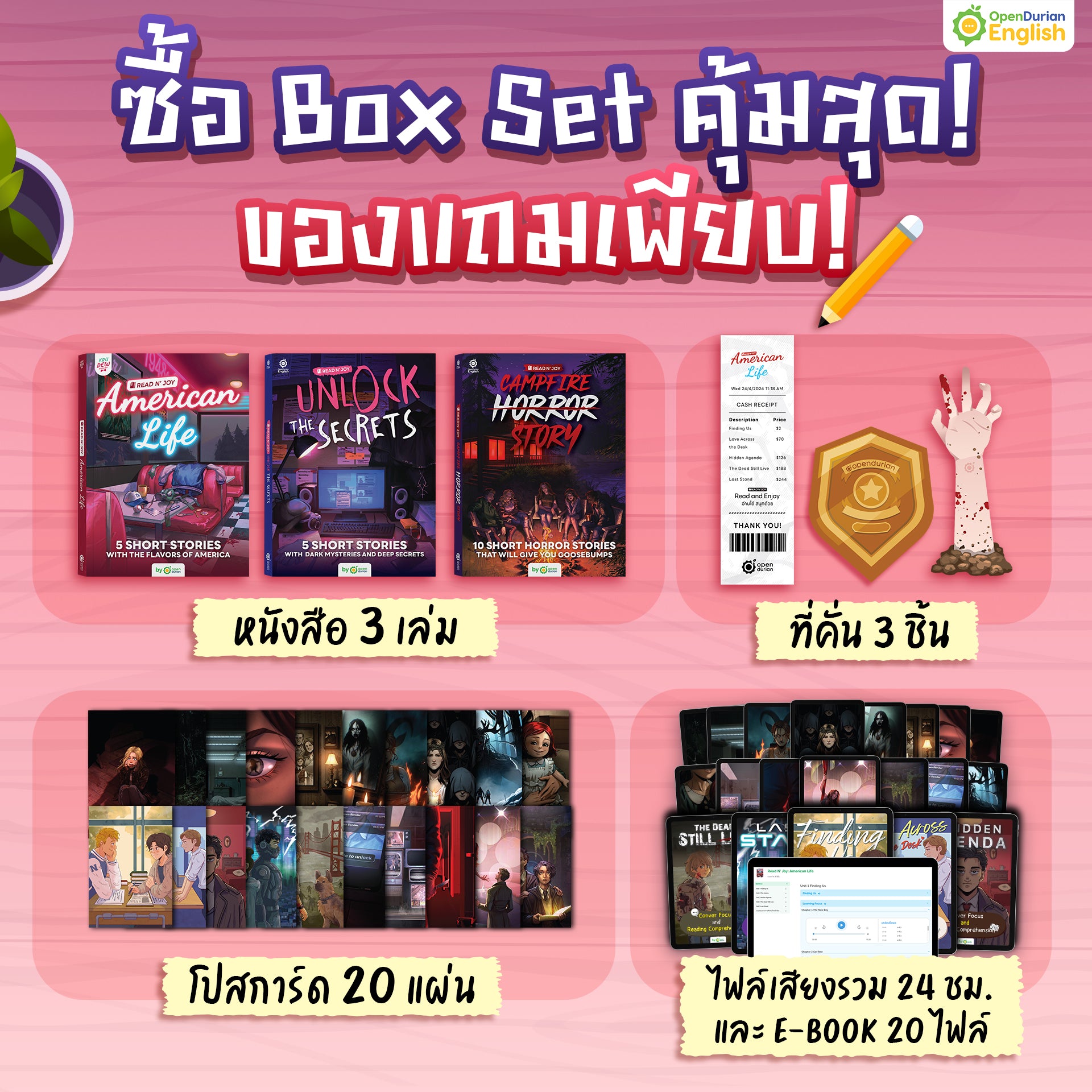 พบกับการผจญภัยผ่านเรื่องสั้นหลากหลายแนวใน Box Set ที่รวบรวม 3 เล่ม ของเรื่องสั้นสองภาษา (อังกฤษ-ไทย) ไม่ว่าจะเป็นเรื่องราวรักหวานซึ้ง ปริศนาลึกลับ ️️ หรือเรื่องเล่าสยองขวัญสุดระทึกใจ ทุกเล่มจะทำให้คุณได้ฝึกภาษาอังกฤษผ่านการอ่านที่ไม่ซ้ำแบบและน่าติดตาม!